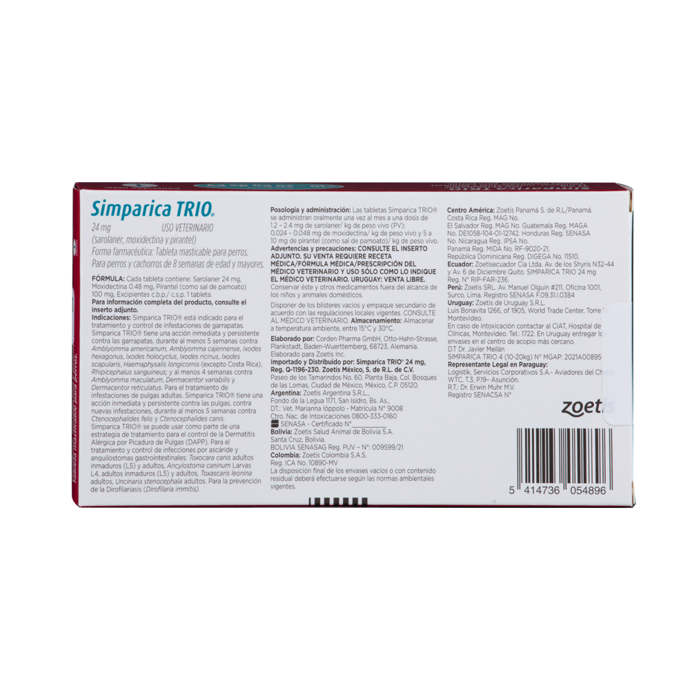 Antiparasitario Interno y Externo para perro Simparica Trio 10 Kg – 20 Kg 1 Tableta