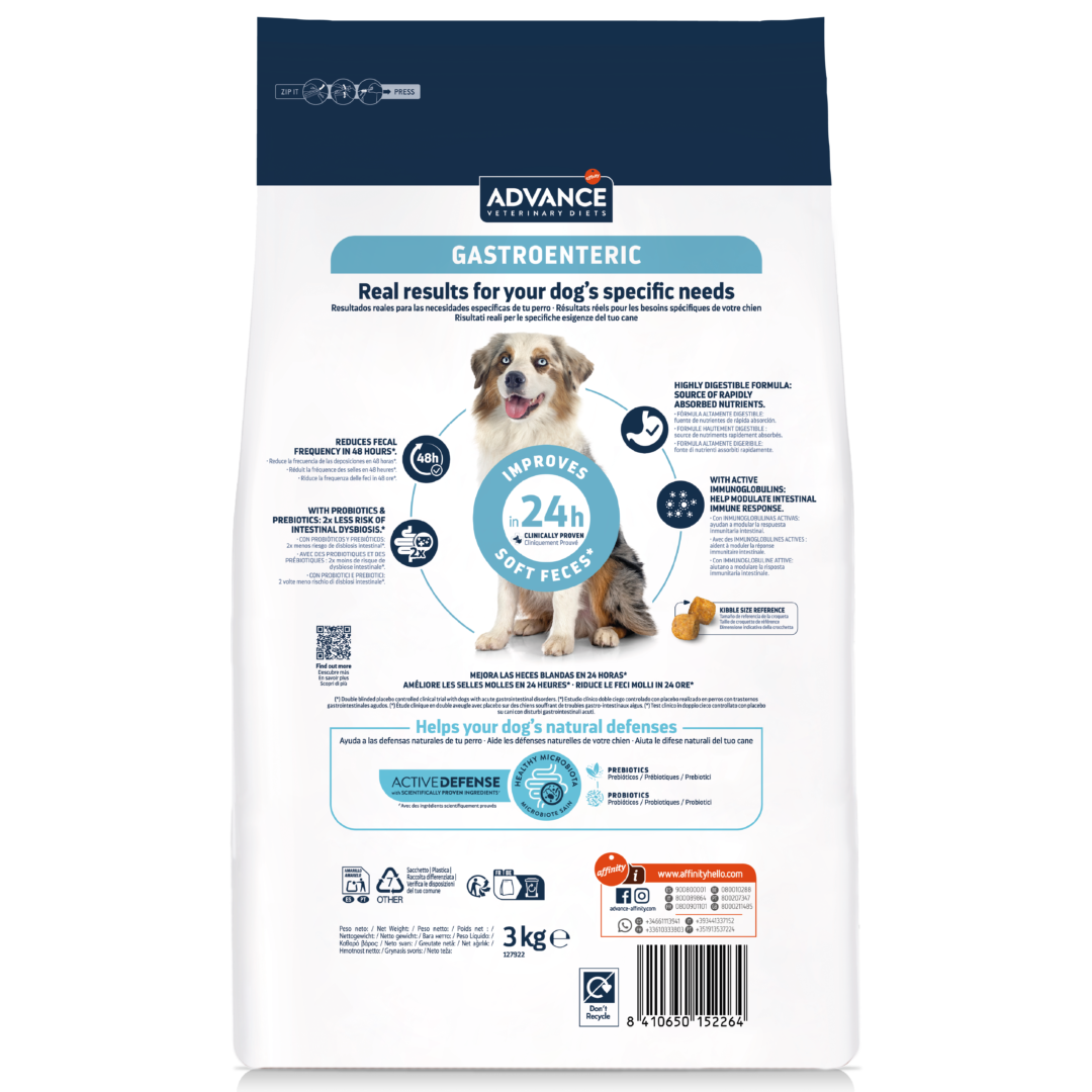 ADVANCE VETERINARY DIETS Gastroenteric es un alimento dietético completo para cachorros y perros adultos, elaborado con ingredientes muy digestibles, nivel bajo de grasa y una mayor proporción de sodio y potasio, para ayudar a reducir ciertas alteraciones gastrointestinales y para casos de insuficiencia pancreática exocrina.
