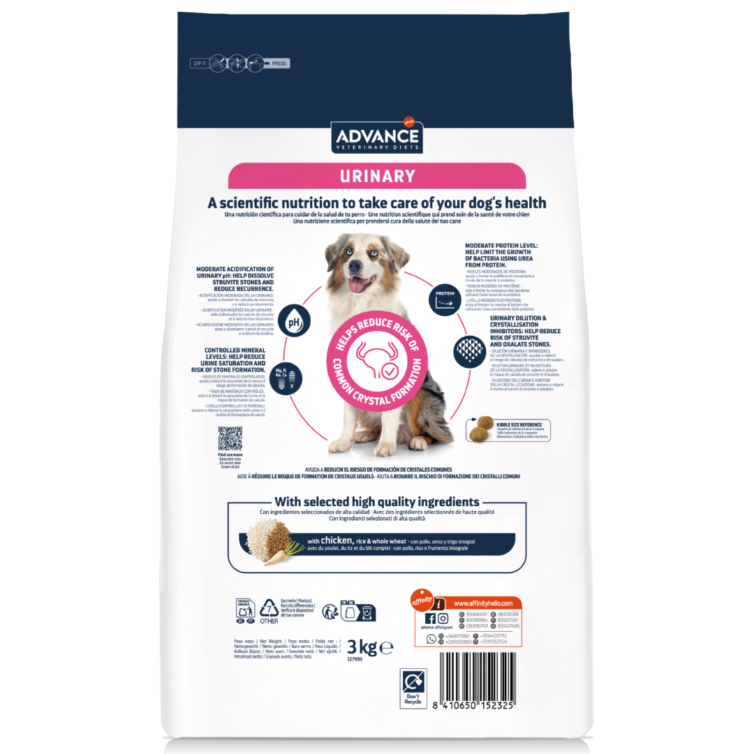 ADVANCE VETERINARY DIETS Urinary es un alimento dietético completo para perros adultos, formulado con un nivel moderado de magnesio y propiedades acidificantes de la orina, indicado para ayudar a reducir la aparición de cálculos de estruvita y oxalato en la orina. Además, ofrece un gran sabor lo que facilita la alimentación diaria en perros que tienen tendencia a sufrir problemas de cálculos.