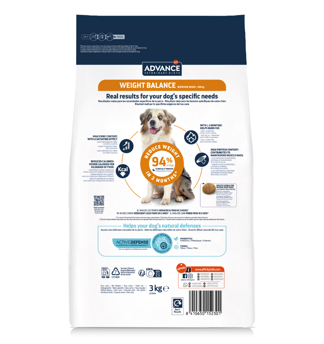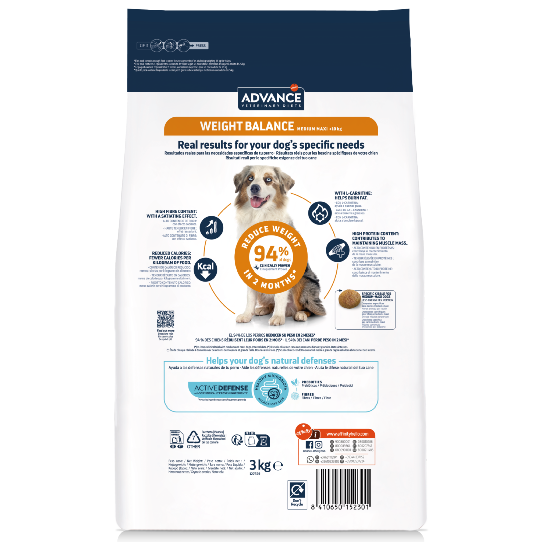 ADVANCE VETERINARY DIETS Weight Balance Medium/Maxi es un alimento dietético completo para perros adultos de tamaño medium/maxi formulado para reducir el exceso de peso y regular el metabolismo lipídico en caso de hiperlipidemia, con niveles bajos de energía, bajo contenido de grasa y alto contenido de ácidos grasos esenciales. Su fórmula además consigue provocar un cambio en la microbiota del perro aumentado su riqueza, volviéndola similar a la de perros en su peso ideal.